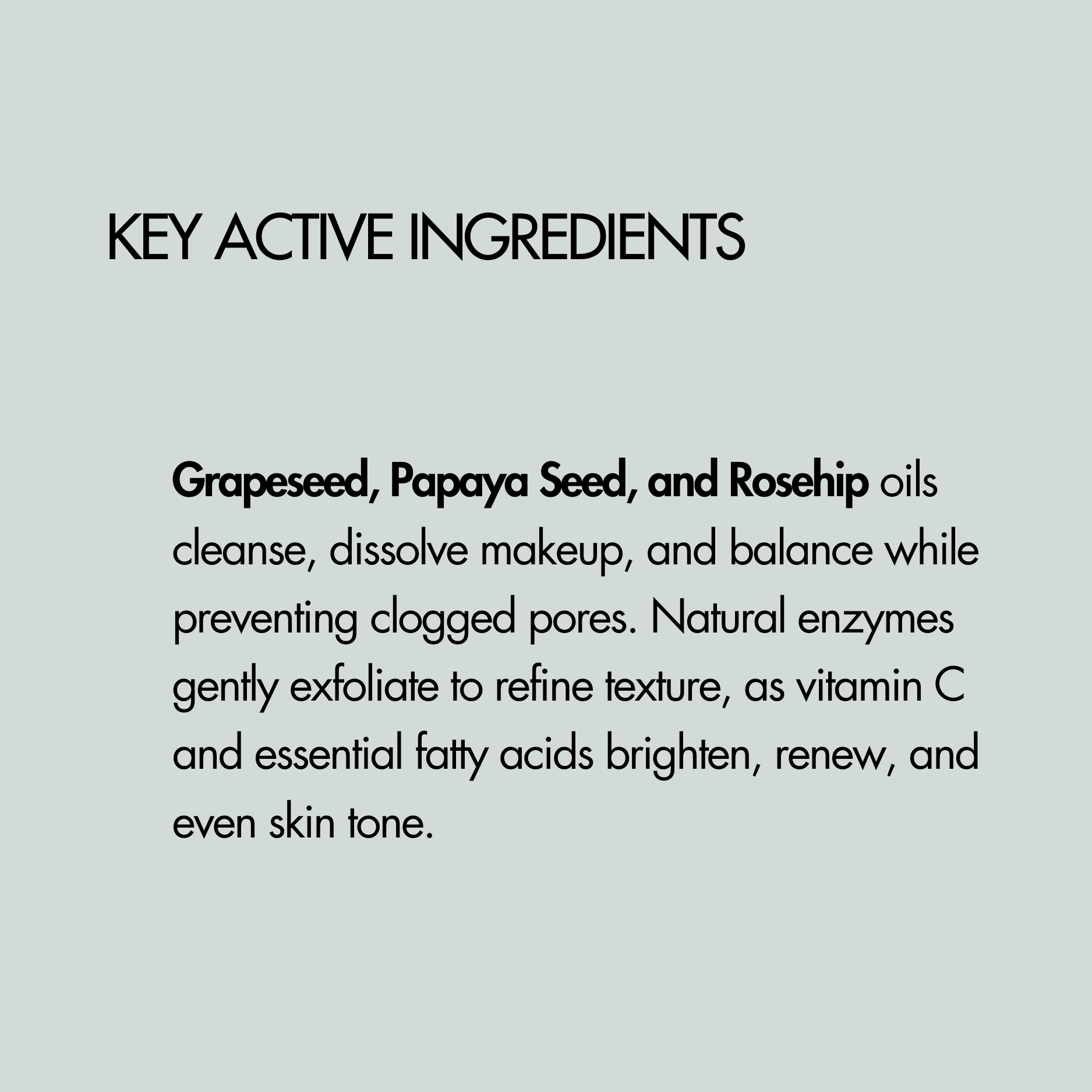 A silky blend of active oils removes makeup, lifts impurities, and naturally exfoliates with papaya seed, leaving skin smooth, hydrated, and radiant. Lightly scented with soft blooms.